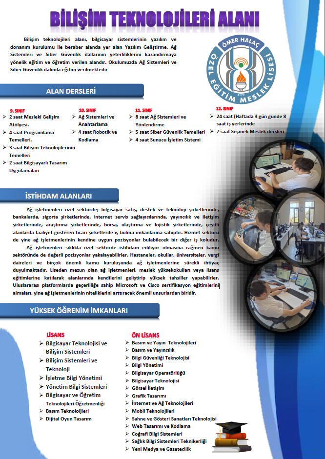 Bilişim Teknolojileri Alanı dallarından biri Ağ İşletmenliği ve Siber Güvenlik dalıdır. Bilgisayar sistemlerinin donanım ve yazılım kurulumu, ağ sistemlerinin kurulumu, yönetimi ve ağ ortamı üzerinde yaşanabilecek sorunlar, çözüm yolları ve geniş ağ sistemleri yönetimine sahip nitelikli kişidir.